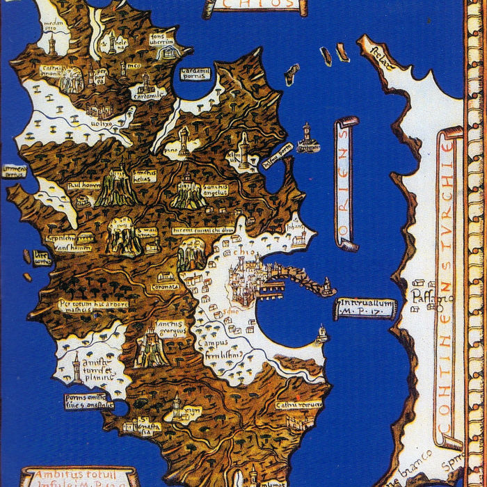 L’isola di Chios raggiunse la massima prosperita’ grazie alla ‘Famiglia dei Giustiniani’ che non era una stirpe, ma l’unione di 12 famiglie genovesi che nel 1349 costituirono “Maona”, la prima societa’ per azioni documentata dalla storia nata per la gestione commerciale di Chios e le isole vicine.