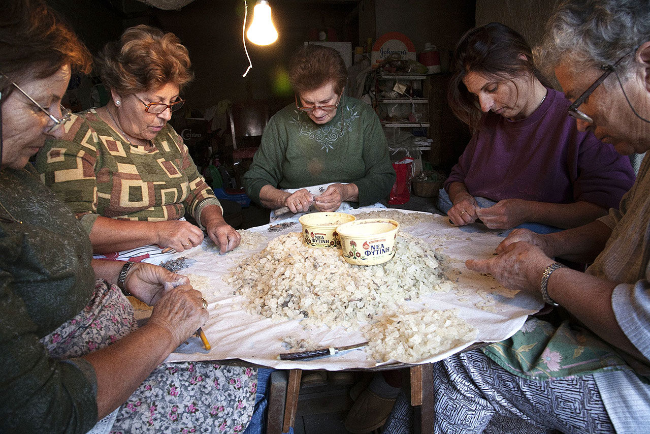 La raccolta della Mastiha avviene esclusivamente da luglio a settembre ed ogni pianta che inizia a produrre dopo circa 5 anni e puo’ vivere oltre un secolo, genera mediamente 300 gr di linfa all’anno.